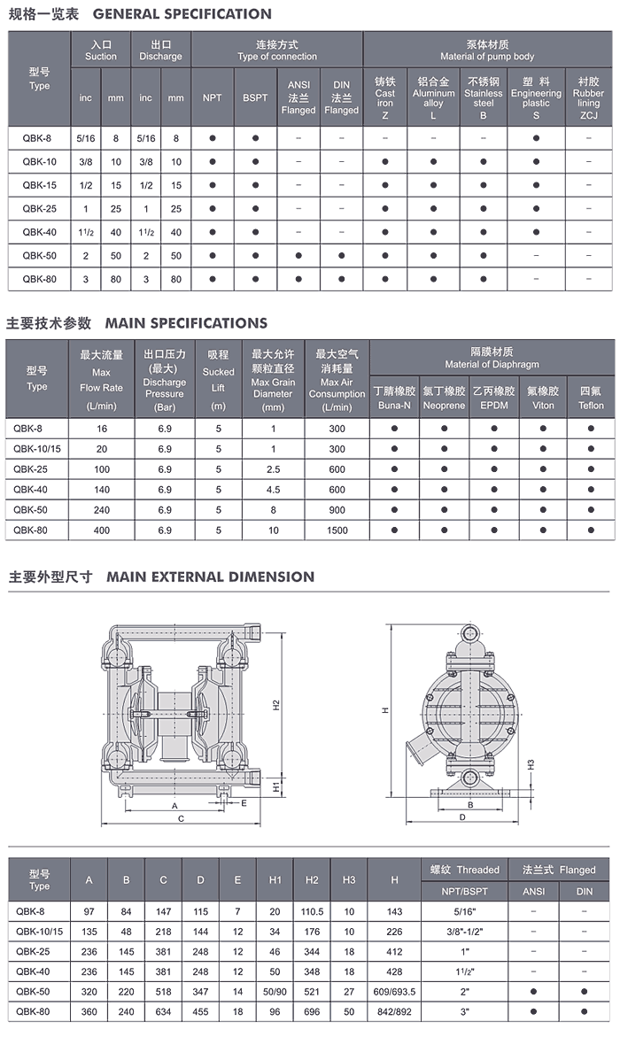 氣動隔膜泵 | QBk-10 | 0~0.8 | 0~50 | 6 | 5 | 1 | 7 | 0.3 | ★ | ★ | ★ | ★ |